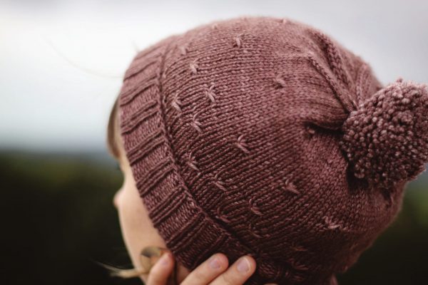 Le bonnet Erell est un patron qui possède un joli point fantaisie très présent dans le bas et qui s’estompe vers le haut. Il possède un grand revers en côtes qui se plie en deux ainsi qu’un gros pompom.