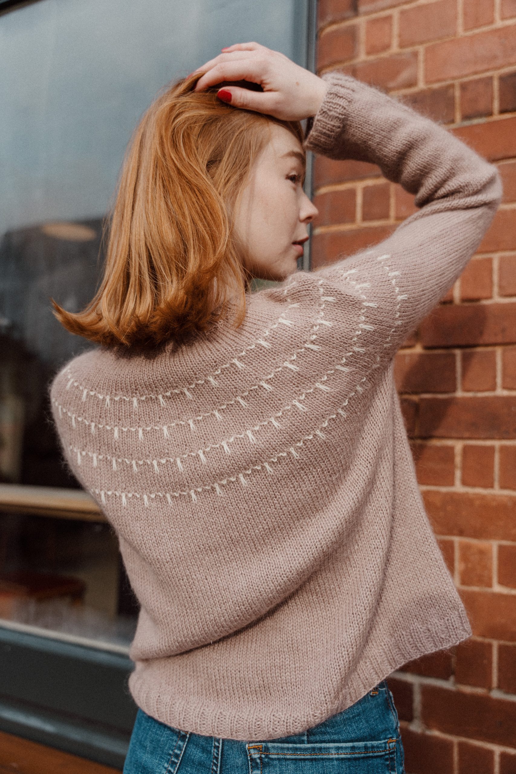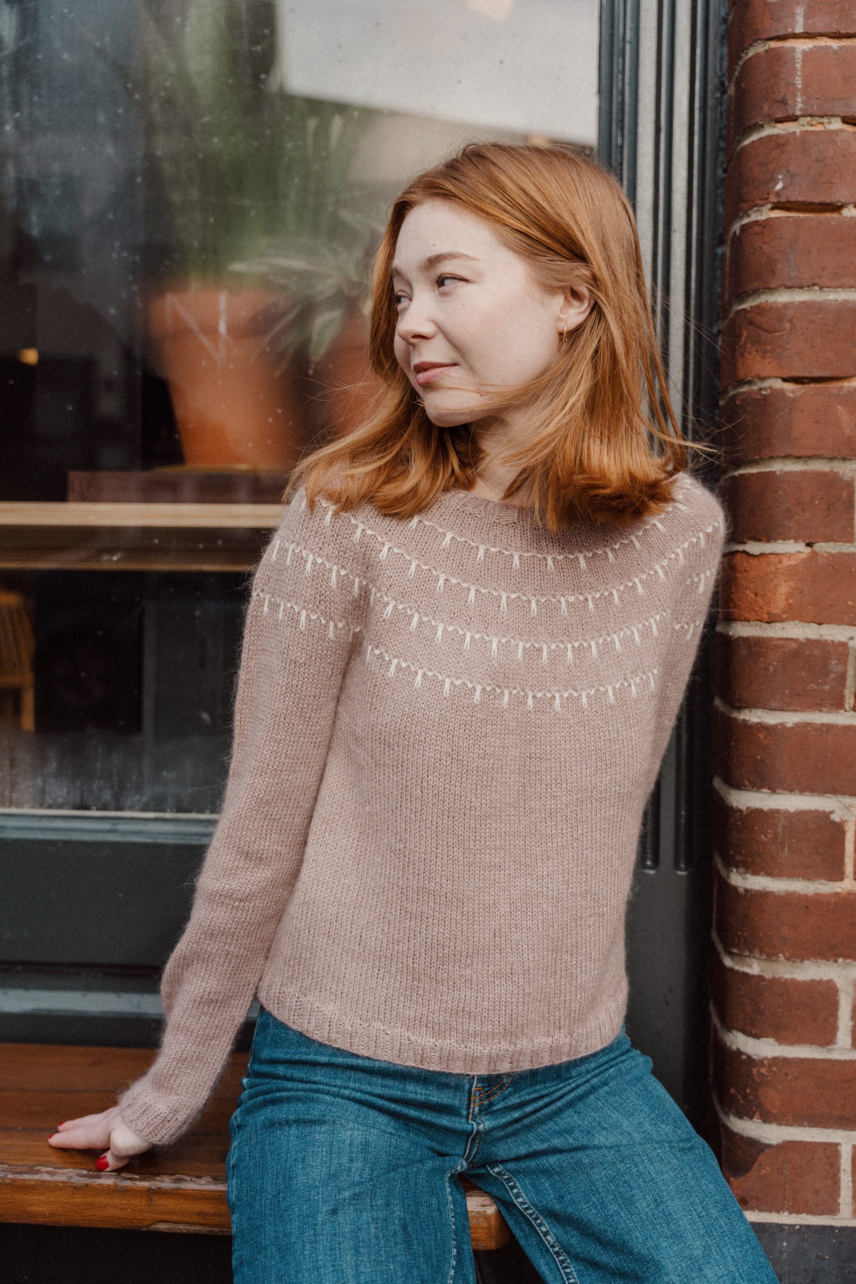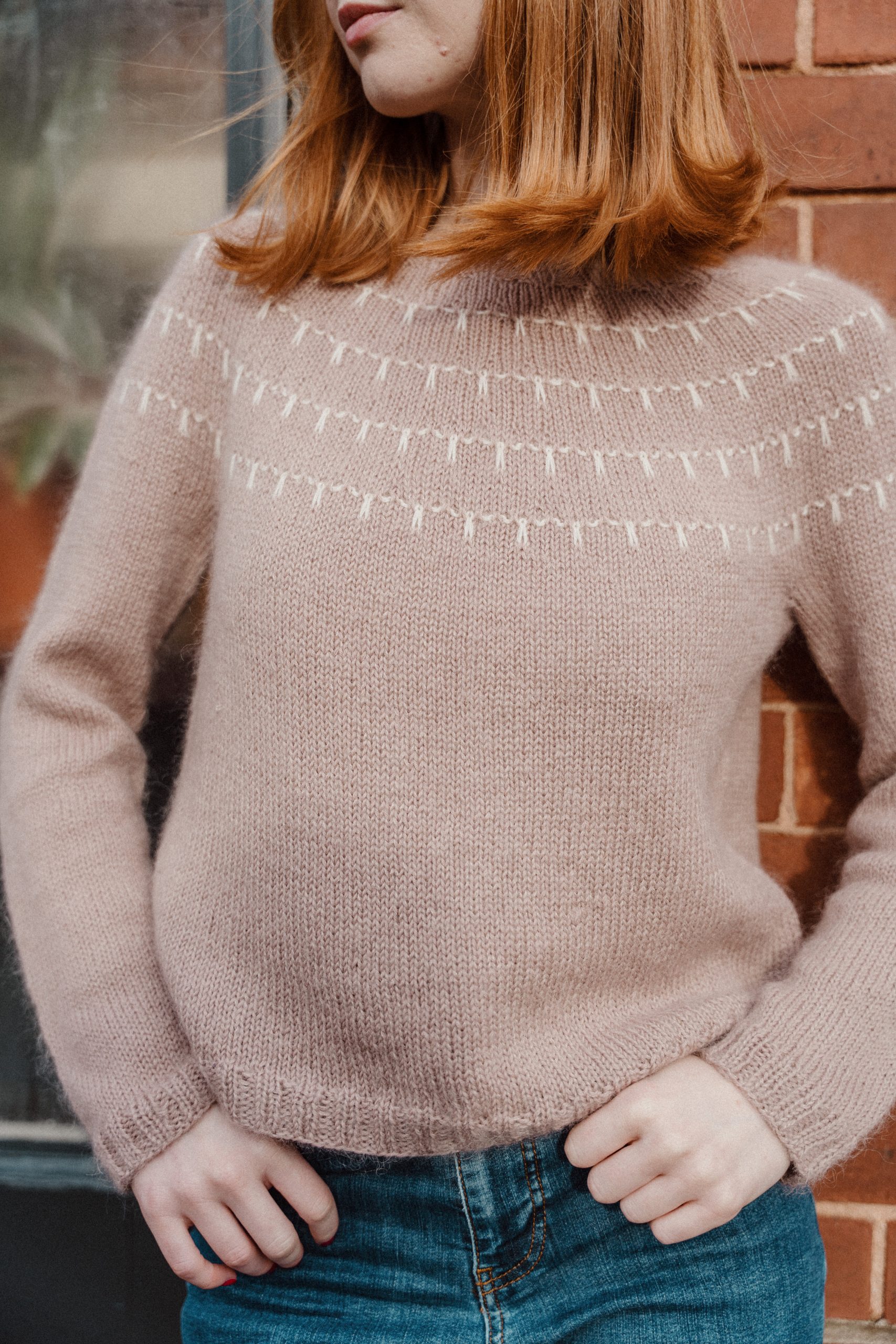 Merrivale (sweater) is a women’s sweater with a circular yoke, featuring a delicate slipped stitch pattern. Finished in 2×2 ribbing, it’s designed for a relaxed fit and comfortable feel.
